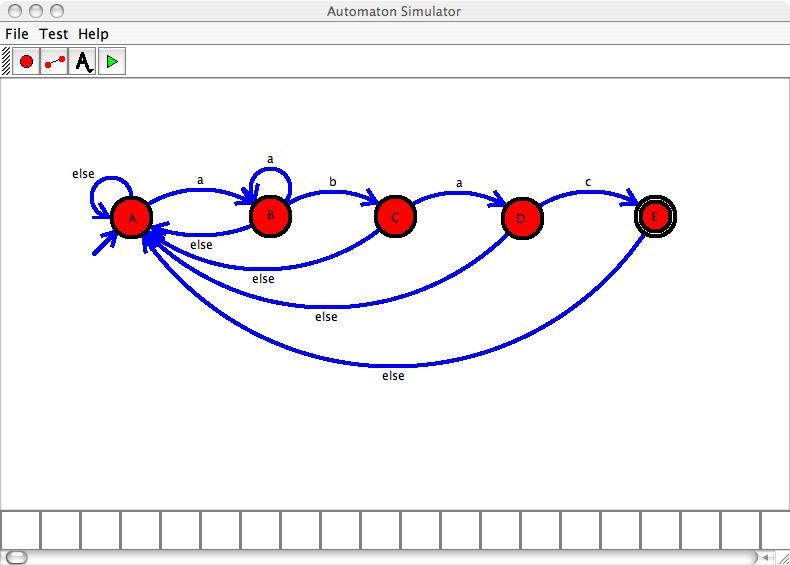 失敗した際には,実際に自分で1つずつ入力してみるのが良いでしょう.緑色の三角ボタンをクリックして,「a」「a」「b」「a」「c」と順にタイプしてみましょう. すると,誤った入力をした際に,常に振り出しに戻るという方策に間違いがあったことが判ります.状態「B」で「a」が入力された際には,状態「B」に留まるべきでした.